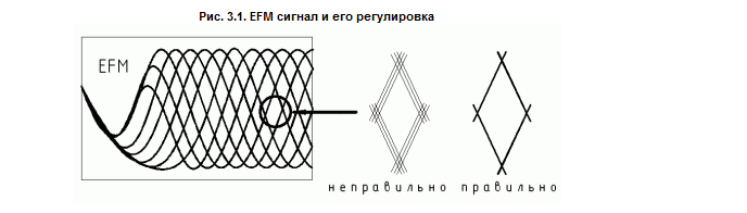 Настроечные элементы: Fofs (Focus Offset) - смещение фокуса, т.е. постоянная составляющая напряжения на катушке фокусировки. Настраивать смещение фокуса нужно с помощью осциллографа. Сигнал EFM при развертке 5...10 МГц должен быть максимально четким и сфокусированным (рис. 3.1).