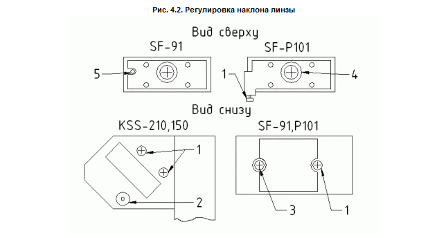 Из-за увеличения наклона линзы уменьшается амплитуда полезных лучей, ухудшается отслеживание трека, поэтому диски плохо читаются. Со временем из-за изменения характеристик материала подвески катушки (внутреннее напряжение и т.п.) наклон линзы может увеличиться. Настройка: Регулировку наклона линзы можно проводить в одной или двух плоскостях, в зависимости от модели ЛГ, либо же она не предусмотрена вообще (рис. 4.2, где 1 - регулировочные винты; 2 - пружина; 3 - винт с пружиной; 4 - фиксирующий винт; 5 - отверстие для регулировочного ключа).