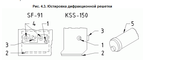 Дифракционная решетка расщепляет лазерный луч на лучи разных порядков. В проигрывателе используются основной луч для считывания информации и два дополнительные луча первого порядка для отслеживания трека. Мощность дополнительных лучей составляет 25% от мощности основного. Регулируя положение дифракционной решетки, можно изменить положение дополнительных (отслеживающих) лучей относительно основного. Регулировка возможна в некоторых (в основном старых) моделях оптических головок (рис. 4.3, где 1 - отверстие для регулировки; 2 - фотодатчик; 3 - лазерный диод; 4 - прижимные винты; 5 - регулировочный ключ).