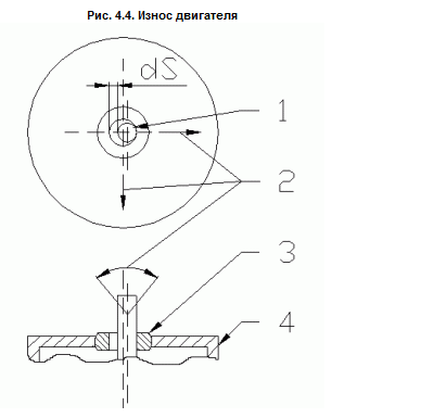 В корпусе двигателя установлены две бронзовые втулки, играющие роль подшипников. В процессе работы втулки изнашиваются, увеличивается зазор между ними и валом двигателя dS (рис. 4.4, где 1 - ось; 2 - направление вибраций; 3 - бронзовая втулка; 4 - корпус), увеличивается вибрация и дребезг вала двигателя.