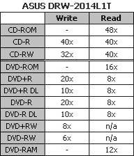 Практически единственным неприятным моментом в работе с накопителем ASUS DRW-2014L1T стала невозможность записи на нем двух DVD-дисков из нашего комплекта. Скорее всего, эта проблема решится с очередным обновлением прошивки привода, однако на данный момент факт остается фактом. В остальном же серьезных претензий к работе привода, по большому счету, нет. По всем своим остальным рабочим параметрам он вполне отвечает требованиям времени для устройств данного класса. DRW-2014L1T поддерживает актуальный интерфейс SATA, обеспечивает хорошую скорость записи дисков и бес проблемно работает с аудиодисками, в том числе даже поцарапанными. К этому можно добавить и присутствие в продаже коробочного варианта привода, который, при минимальной разнице в цене, отличается наличием сменной лицевой панели другого.
