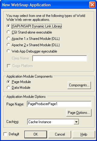 WebSnap-прикладення в реальних проектах містить декілька модулів сторінок. Додамо новий модуль сторінки у прикладення командою File | New | Other | Web Snap | WebSnap Page Module. У діалозі вибору параметрів модуля (мал. 3.11) натиснемо кнопку ОК, - одержимо модуль сторінки з ім'ям PageProducerPage2 (мал. 3.12).