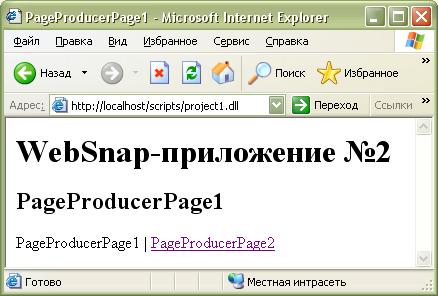 Тепер залишилося зберегти і скомпілювати проект. Одержаний виконуваний файл і шаблон сторінки Unit1.html треба розташувати на Web-сервері у каталозі скриптів (для IIS це каталог c:\Inetpub\Scripts). Запустимо Web-браузер Internet Explorer і в рядку адреси наберемо http://localhost/Scripts/Project1.dll (у разі використання Apache та для інших Web-серверів адреса буде іншою). У вікні браузера ми побачимо напис PageProducerPage1 (мал. 9).