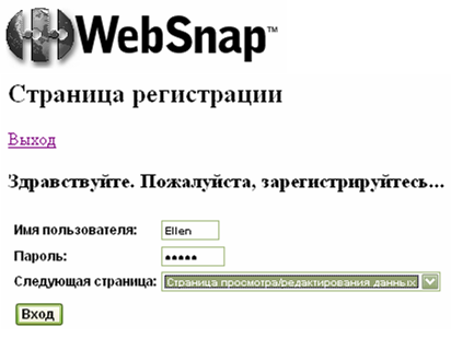 Оберімо Вход або Страница просмотра/редактирования данных, введемо в поля Имя польователя і Пароль (мал. 25) ім'я Ellen і пароль admin, як наступну сторінку указуємо Страница просмотра/редактирования данных, натискаємо кнопку Вход.