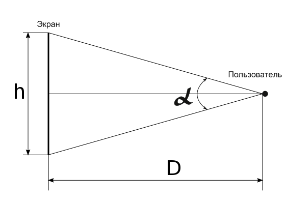 Чтобы вычислить оптимальную величину текстового поля необходимо вывести зависимость размера отображаемой информации от угла обзора человека и его удаленности от экрана монитора (рис.1)