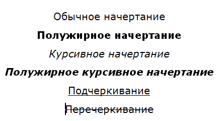 Каждый тип шрифта имеет несколько начертаний символов, например, полужирный, курсив, полужирный курсив, обычный (рис.4). Кроме того, можно ввести подчеркивание символов и фрагментов текста.