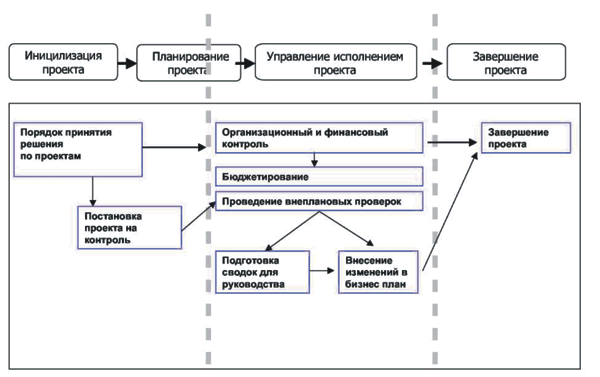 На первом этапе осуществляется обоснование проекта, составляется перечень работ и имеющихся ресурсов, производится распределение ресурсов по работам и оптимизация плана по критериям времени завершения проекта, суммарной стоимости проекта, равномерного распределения ресурсов, минимизации рисков. Здесь же производится заключение всех необходимых договоров со сторонними исполнителями, подрядчиками и поставщиками. Второй этап предполагает контроль выполнения проекта с целью своевременного выявления и устранения наметившихся отклонений от первоначального плана. При значительных отклонениях первоначальный план перерабатывается и составляется новый. Завершение проекта означает выполнение определенных регламентированных действий, необходимых для завершения и прекращения работ по проекту. Например, подписание акта приемки / сдачи выполненных работ[24].