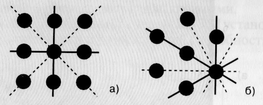 Рисунок 2 – В ортогональних растрових решітках напрямки максимальної (– – – –) і мінімальної (─) роздільної здатності, повторюються через 90° (а), а в гексагональних решітках – через 60° (б)