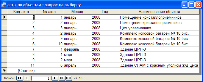 Рисунок 3.10 - Результат запроса «Акты по объектам»