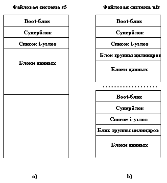 В мире UNIX существует несколько разных видов файловых систем со своей структурой внешней памяти. Наиболее известны традиционная файловая система UNIX System V (s5) и файловая система семейства UNIX BSD (ufs). Файловая система s5 состоит из четырех секций (рисунок 2.2,a). В файловой системе ufs на логическом диске (разделе реального диска) находится последовательность секций файловой системы (рисунок 2.2,b).