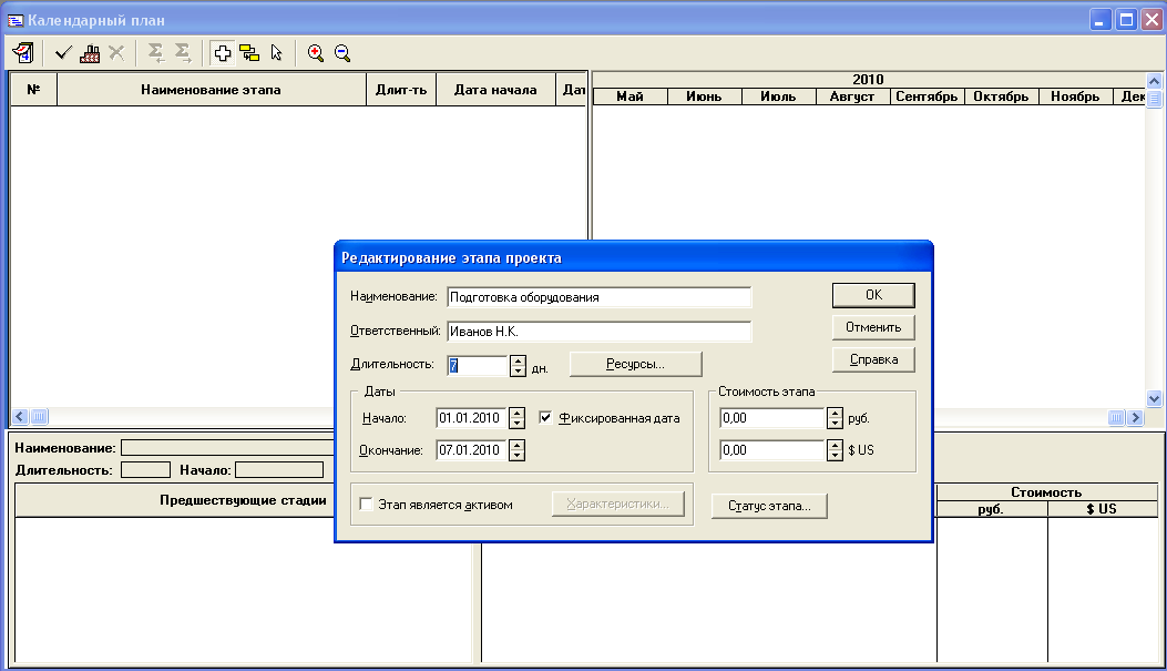 Добавляем этап Производство, вернувшись в окно Календарный план, устанавливаем начало производства с 16.01.2010г.