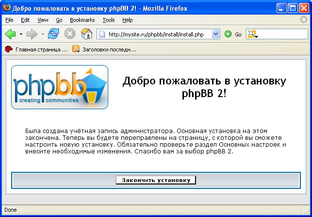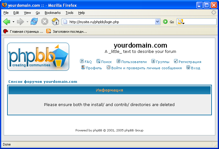 Осталось удалить каталоги install и contrib (из соображений безопасности), иначе форум работать не будет. На этом установку можно считать завершенной.