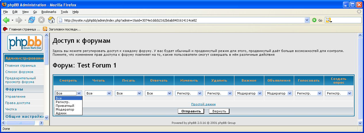 Рис.8. Раздел Форумы/Права доступа (Forums/Permissions) позволяет установить права доступа к конкретному форуму. Доступны следующие варианты: