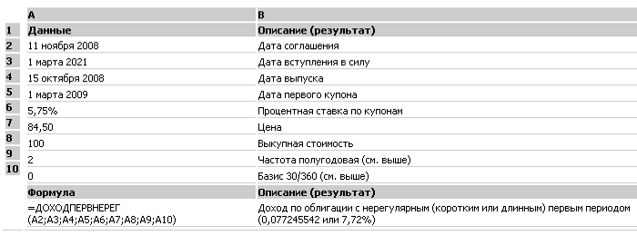Если ставка < 0 или цена ≤ 0, то функция ДОХОДПЕРВНЕРЕГ возвращает значение ошибки #ЧИСЛО!.