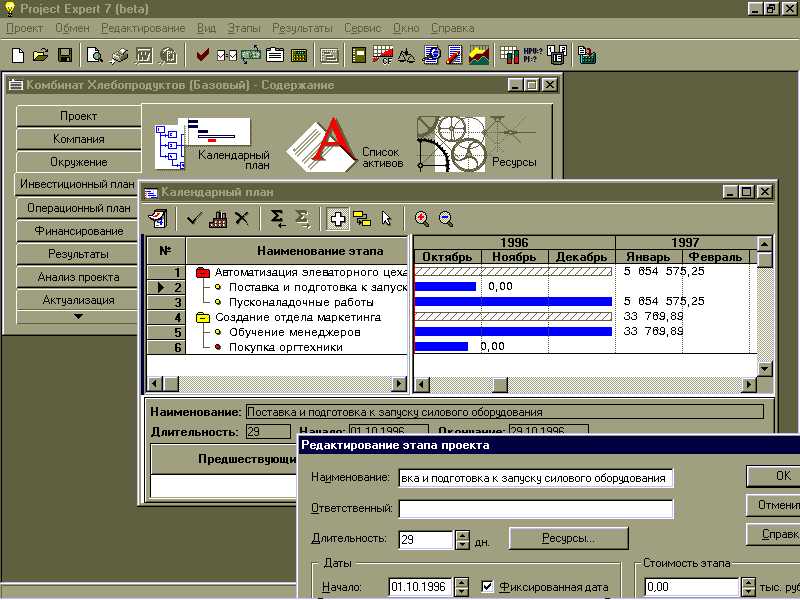 Система достаточно гибко подходит к представлению данных о проекте, позволяя либо увязывать все этапы инвестиционной и дальнейшей операционной деятельности, либо описывать эти стадии проекта независимо. В системе Project Expert упор сделан на финансовые аспекты подготовки проекта – стоимость подготовительных работ, используемые ресурсы и особенности учета инвестиций.