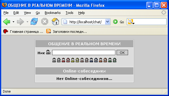 Для работы с чатом в строке браузера вводят URL, например: http://localhost/schat/. Открывается окно для регистрации: