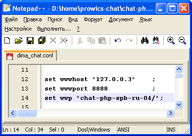 Откройте dima_chat.conf. Впишите туда то же самое, что было в переменных $wwwhost и $wwp из _dima.php. В $wwwport впишите то, что было в переменной $httpport из _dima.php (по-умолчанию в обоих местах стоит 8888, но можно изменить).