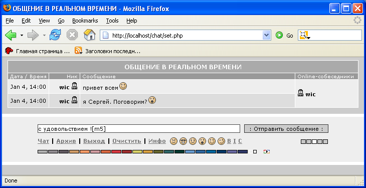 Чат Simple Chat (http://hot-things.net ) —написан на РНР. Работает быстро, вывод сценария небольшой, поэтому нет большой нагрузки на трафик. Архив чата занимает 34 Кб. Преимущества чата Simple Chat: