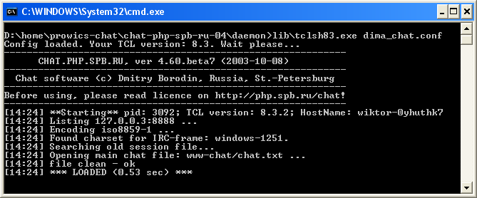 После этого чат "захватит" вашу консоль, т.е. будет отображать ход своей работы в шелле, где вы его запустили. Так вы сможете смотреть все сообщения чата, даже те, что не идут в лог файл! Важно помнить, что при запуске чата с помощью run_this и после выхода из шелла (когда вы закроете SSH-клиент типа PuTTY или др. программу) - чат будет завершен и выгружен из памяти сервера. Только лишь run_background позволяет запустить чат в фоновый режим, что не захватывает вашу консоль (команда завершается мгновернно) и вы можете выйти из шелла, а чат останется работать. После запуска run_this чат запускается в своем обычном режиме, только с особенностью выгрузки при закрытии шелла. Смотрите на сообщения, что пишет чат-сервер. Если команда завершается быстро, т.е. после некоторых сообщений вы попадаете обратно в командную строку шелла, то значит произошли ошибки. Если ошибкок не будет, то чат останется работать и будет постоянно выводить в шелле свои отладочные сообщения. Все сообщения без слова "ERROR" не являются ошибками. Как только вам надоет смотреть на сообщения, нажмите Ctrl+C, чат будет прерван. Далее запустите run_background для нормальной работы чата (если ошибок не было или все исправлены).