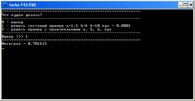 Writeln('1 - решать тестовый пример a=1,5 b=6 k=10 eps = 0.0001');