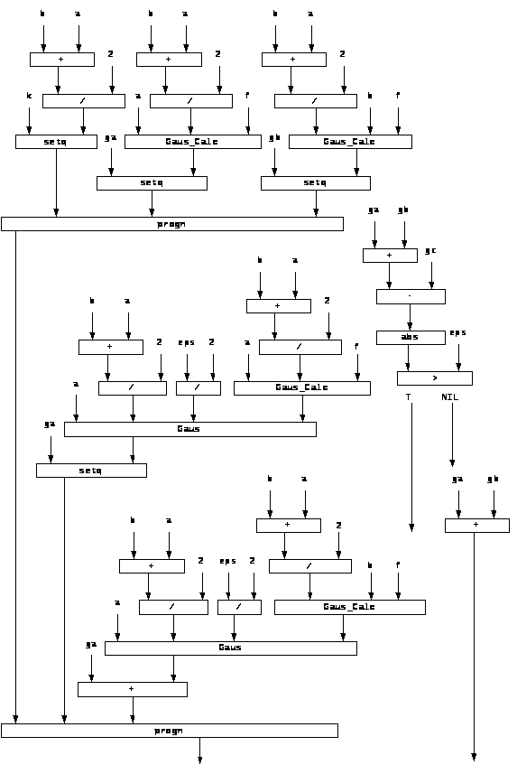 (setq ga (Gauss a (/ (+ a b) 2) (/ eps 2) (Gauss_Calc a (/ (+ a b) 2) f) f))