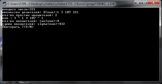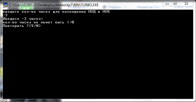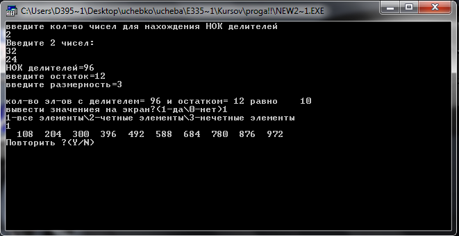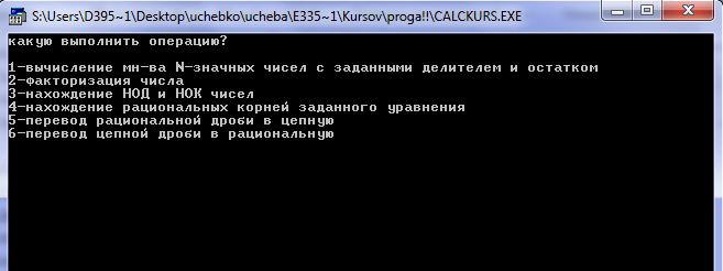делителя и остатка на отриц-сть} begin write ('делитель или остаток не могут быть<0 '); end else begin if i>k then {проверка на делитель>остатка} begin write ('введите размерность='); readln(R); if R<=0 then begin writeln ('некорректная размерность '); readln; end else begin if R=1 then begin a:=1; b:=9; end else begin a:=pow(10,(R-1)); {инициализация верх и нижн границ} b:=pow(10,R); b:=b-1; end; end; if b<i then {проверка на делимое>делителя} writeln ('делиоме не может быть < делителя ') else begin SUM:=0; {обнуление сумы кол-ва эл-ов} for D:= a to b do begin if (D mod i)=k then {проверка эл-ов на условие} begin SUM:=SUM+1; end; end; writeln; writeln ('кол-во эл-ов с делителем=', i:3, ' и остатком=', k:3, ' равно', SUM:6); end; {b<i} end {if i>k} else write ('остаток не может быть > делителя '); end; {if otriz} {\\\\\\\\\\\\\\\\\\\\\\\\\\\\\\\\\} write ('вывести значения на экран?(1-да\0-нет)'); readln(S); if S=1 then if SUM=0 then writeln('нет эл-ов, удовл. условию') else begin for D:= a to b do if (D mod i)=k then begin write(' ',D:4); {вычисление кол-ва делителей и их мн-ва} for i:= 1 to n do begin write(numb[i], ' ^ ', powers[i]); k:=k*((pow(numb[i],powers[i]+1) - 1) div (numb[i] - 1)); t:=t*(powers[i]+1); {кол-во делителей} if i <> n then write(' * '); end; writeln; writeln('кол-во множителей: tau(num)=',t); writeln('сумма множителей: sigma(num)=',k); writeln('Повторить ?(Y/N)'); q:=ReadKey; until q in ['N','n']; clrscr; end;{Factor} {----------------------------------------} procedure NodNok; type TArray=array [1..200] of integer; var a,b:TArray; i,l,j,maxa,minj,maxj:longint; k,d:longint; n:integer; q:char; begin repeat clrscr; writeln('введите ко-во чисел для нахождения НОД и НОК'); readln(n); writeln('введите ',n,' чисел: '); if n<=0 then writeln(‘кол-во чисел не может быть<=0’) else begin readln(a[1]); b[1]:=a[1]; maxa:=a[1]; for i:=2 to n do begin readln(a[i]); b[i]:=a[i]; if a[i]>maxa then maxa:=a[i]; end; i:=1; while (a[i]=0) and (i<=n) do inc(i); if i=n+1 then writeln('НОД – любое число') else begin for j:=1 to n do if a[j]=0 then a[j]:=a[i]; k:=1; for i:=2 to maxa do begin minj:=1000; for l:=1 to n do begin j:=0; while (a[l] mod i=0) do begin a[l]:=a[l] div i; inc(j); end; if (j<minj) then minj:=j; end; if (minj<>0) then for l:=1 to minj do k:=k*i; end; vecb[k]:=-j; k:=k+1; end; end; a:=1; for j:=1 to abs(vec[1]) do begin if (vec[1] mod j)=0 then begin veca[a]:=j; a:=a+1; { veca[a]:=-j; a:=a+1;} End; end; b:=a; for j:=1 to k-1 do Begin for a:=1 to b-1 do Begin Begin c:=i; sum:=0; for i:=1 to c do Begin sum:=sum+vec[i]*pow1(vecb[j]/veca[a],c-i); if (sum<0.00001) and (sum>-0.00001) then if vec[a]=1 then writeln('ответ:',round(vecb[j])) else writeln('ответ:',round(vecb[j]), '/',round(veca[a])); end; End; End; End; end; readln; end;{SuperGorner} {----------------------------------------} procedure Express; var a,b,t:integer; q:char; begin repeat writeln('введите числитель='); readln(a); writeln('введите знаменатель='); readln(b); if b=0 then writeln(‘знаменатель не может быть=0’) else begin write('['); while (a mod b>0) do begin write(a div b,','); a:=a mod b; t:=b; b:=a; a:=t; end; write(a div b, ']'); end; writeln(‘Повторить ?(Y/N)'); q:=ReadKey; until q in ['N','n']; clrscr; end;{Express} {----------------------------------------} case k of 1:DelOstatok; 2:Factor; 3:NodNok; 4:SuperGorner; 5:Express; 6:AntiExp; else writeln ('нет операции'); end;{case} writeln('Повторить выполнение калькулятора ?(Y/N)'); q:=ReadKey; until q in ['N','n']; clrscr; readln; end.{prog} |
