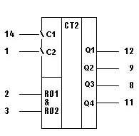 Данная микросхема – четырехразрядный двоичный счетчик, выложенный на двухступенчатых триггерах J-K типа. Счетчик имеет два счетных входа С1, С2 и два входа установки нуля R01, R02. Вход 01 внутренне не соединён с последующими триггерами. Это даёт возможность использовать схему в двух независимых режимах работы в качестве: четырехразрядного двоичною счетчика, когда входные счетные импульсы поступают на вход С1. Выходы осуществляют операцию деления на два, четыре, восемь и шестнадцать; трехразрядною двоичного счетчика, когда входные счетные импульсы поступают на вход С2. Первый триггер, не соединенный с другими триггерами схемы, можно использовать как элемент для функции деления на два. Установочные входы микросхемы обеспечивают прекращение счета и возвращают все четыре триггера в состояние низкого уровня, когда на входы R01 и R02 одновременно подается высокий уровень напряжения. При операции счета на одном из входов установки R01 или R02 должен присутствовать потенциал низкого уровня. Таблица истинности показывает состояние на выходах схемы во время операции счета импульсов. (Выводы С2 и Q1 соединены, тактовые импульсы подаются на С1)