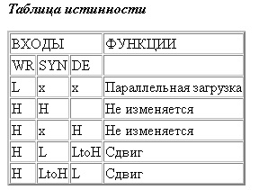 После установки высокого уровня напряжения на входе выбора режима «WR по положительному фронту тактового импульса на входе синхросигнала SYN или входе блокировки синхросигнала DE происходит сдвиг. При высоком уровне напряжения на одном из входов SYN или DE состояние регистра не изменяется.