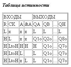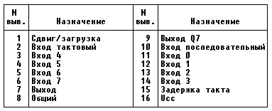 Микросхема представляет собой восьмиразрядный сдвиговый регистр с последовательной загрузкой и параллельной выгрузкой. Наличие двух входов загрузки А и &А позволяет использовать один из них в качестве управляющего загрузкой данных: низкий уровень на одном из них запрещает прохождение сигнала со второго.