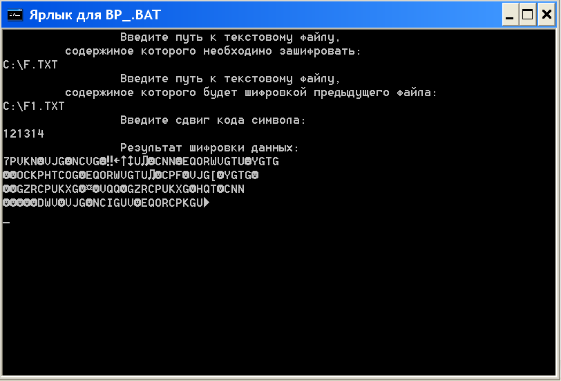 В строкову змінну (s) заноситься інформація файла, який шифрується, а потім ASCII код кожного символу цієї строкової змінної зміщується в сторону зростання на величину ключа коду (sdvig). Потім в іншу строкову змінну (ss) заносяться всі кодовані символи і ця змінна записується до файлу, який має містити шифрований текст.