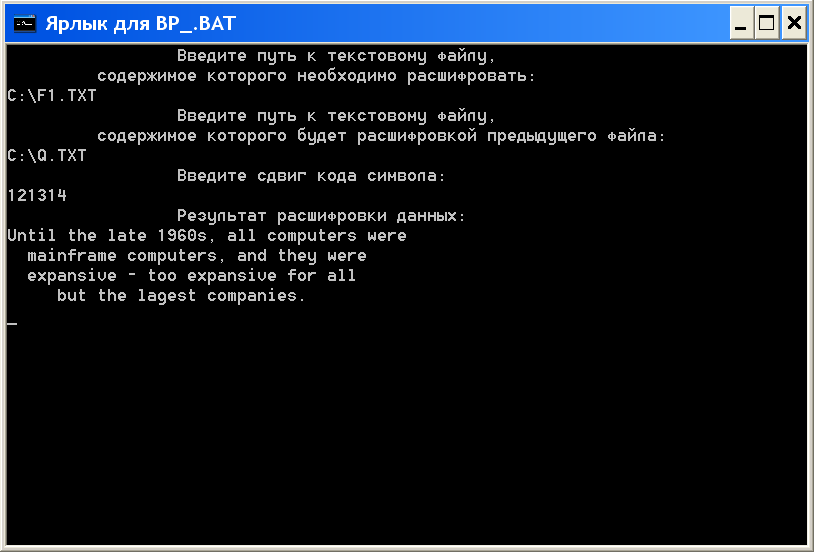 writeln(' содержимое которого будет шифровкой предыдущего:');