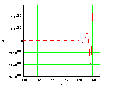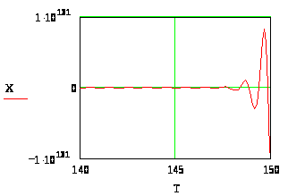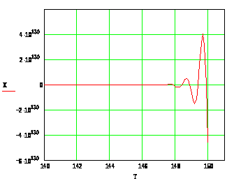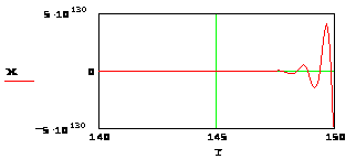 Графическое представление результатов численного решения дифференциального уравнения 4-го порядка в декартовой системе координат представлено на рисунке 3. График изображён так, что можно проверить значения строки 1500. При Т=150, Х=4,563*10^130