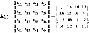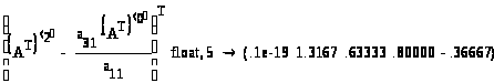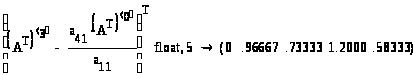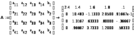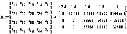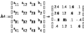 Преобразуем матрицу А, для чего умножим первую строку расширенной матрицы на а>21>/а>11> и вычтем из второй строки расширенной матрицы, затем первую строку умножим на а>31>/а>11> и вычтем из третьей строки расширенной матрицы, далее первую строку на а41/а11 и вычтем из четвёртой строки, что с помощью Mathcad будет выглядеть так: