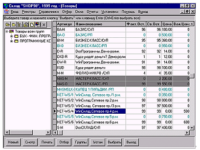 Вызов: Из Главного меню, пункт справочники, подпункт Товары. Из п. Товар меню Отбор Главного меню и при вводе складских документов (НовТвр).