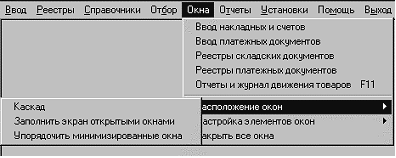 Управление расположением открытых окон программы, а также настройка общих элементов окон в т.ч. вывода панелей функциональных клавиш в окнах, панели быстрого доступа производится из п. Окна Главного меню программы.