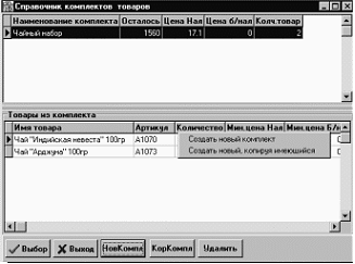 В зависимости от того, в какой части панели Справочника был расположен курсор в момент вызова операции, происходит удаление либо комплекта (курсор в таблице комплектов), либо товаров (курсор в таблице товаров).