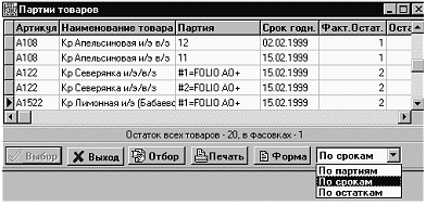 Товары Справочника партий по умолчанию отсортированы по артикулу, дополнительно внутри артикула они могут сортироваться (см. Рис. 3-8) по партиям, срокам годности и остаткам, а также по поставщику, если он указан в Справочнике товаров. В последних версиях возможен сквозной отбор по партии, причем как по полному значению, так и по частичному включению.