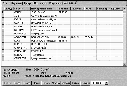 Для ввода данных в документ реализован отбор (кнопка Отбор) товаров из Справочника по артикулу, диапазону сроков годности, диапазону остатков (причем 2-й и 3-й отбор являются альтернативными), а также по поставщику (отбор по полному и частичному совпадению). Окно Панели "Организации" (Справочник организаций). Закладка "Мои фирмы" панели коррекции комплекта товаров представлена на рисунке 8.