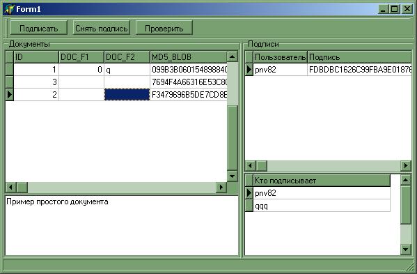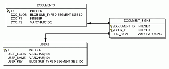 В БД заведена таблица документов DOCUMENTS, подлинность которых нам и нужно контролировать, таблица DOCUMENT_SIGNS - подписи документов определенными пользователями из таблицы USERS.