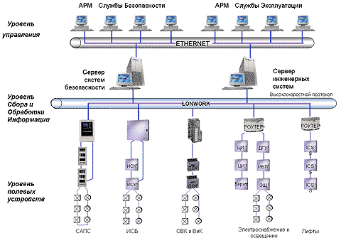 На уровне управления информацией и администрирования системы располагаются рабочие станции диспетчеров со специализированным программным обеспечением. Здесь архивируется и анализируется работа всех систем здания в целом.