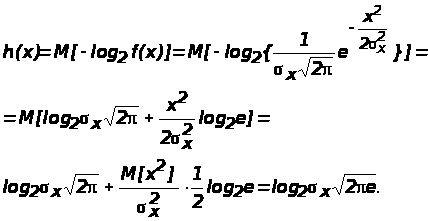 Определим дифференциальную энтропию для нормального распределения, т. е. сигнала с ограниченной средней мощностью. Полученное в результате решения вариационной задачи нормальное распределение является симметричным. Если в интеграле для дифференциальной энтропии произвести замену x = y-m>x>,> >то интеграл не изменится, а значит, энтропия не зависит от математического ожидания и равна энтропии центрированной случайной величины.