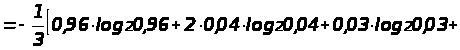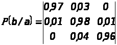 Пример 4. Определить энтропию приемника сообщений, если вероятности появления символов a>1>, a>2> и a>3> на входе источника сообщений равны P(a>1>)=0,5; P(a>2>)=0,3 и P(a>3>)=0,2, а канальная матрица имеет вид: