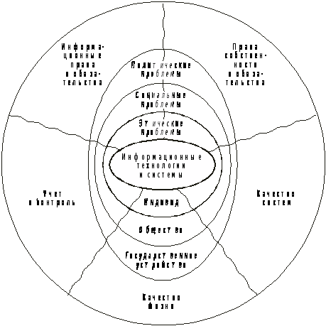 В любом обществе этические и социальные аспекты его существования тесно переплетены между собой, что создает трудности при их рассмотрении. Рис. 1 иллюстрирует один из подходов к их учету при анализе возможных последствий внедрения ИТ.