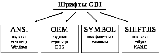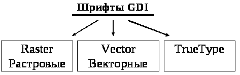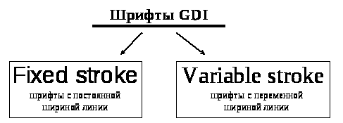 Со шрифтами устройств мы разбираться не будем, так как это очень специфичные шрифты и их свойства жестко определены возможностями аппаратуры. Основное внимание мы сосредоточим на шрифтах GDI.
