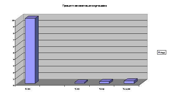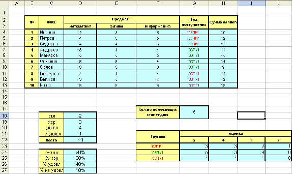 Согласно созданному заголовку в таблицу были введены: количество отличников, количество учащихся на "хорошо", количество учащихся на "удовлетворительно", количество учащихся получающих стипендию, процентное соотношение "отл", "хор", "удовл". Общий вид таблицы приводится в приложении Б.