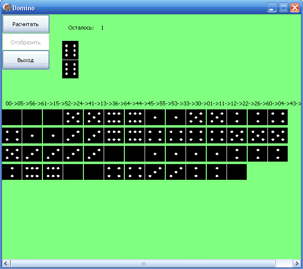 Кнопка «Отобразить» графически показывает полученную последовательность, а так же не использованные домино, и через некоторое время (генерация занимает от 1-й до 4-х секунд) мы видим результат работы.