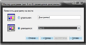 Кнопки < Назад и Далее > предназначены для передвижения внутри Мастера диаграмм по шагам. На первом шаге кнопка < Назад недоступна, так как движение еще на один шаг назад невозможно. На последнем шаге кнопка Далее > недоступна, так как четвертый шаг последний и продвижение вперед невозможно. Непонятно, зачем эти кнопки вообще там присутствуют, так как убрать их программным путем очень просто.