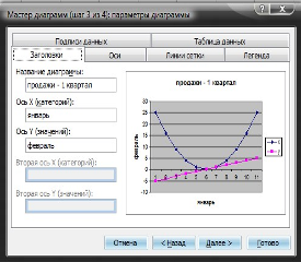 Отображаемое диалоговое окно (рис. 4) позволяет установить целый ряд параметров, определяющих, например, должны ли присутствовать на диаграмме заголовки, линии сетки, легенда, подписи рядов и таблица со значениями, на основе которых была создана диаграмма.