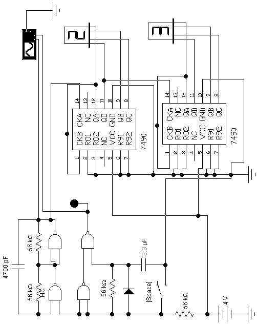 Так як N=50, а T>=0,2 с – середній час реакції людини, то при частоті генератора 2...3 кГц буде мати місце багатократне заповнювання лічильника, а зупинка його буде при відпусканні кнопки запуску. З того моменту запускається одновібратор на 2...3 с и дозволяє світіння ціфрових індикаторів. Цей час обран виходячи із вимог достовірного зчитування отриманної інформаціїї, та мінімального енергопостачання.