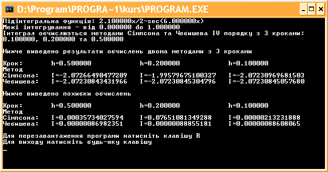 Програма, написана для вирішення поставленої задачі, містить кілька підпрограм. Спочатку програма виводить загальні відомості про своє призначення, потім пропонує змінити деякі параметри, після чого виконує обчислення інтегралу згаданими вище методами з кроками 0.1, 0.2 та 0.5. Підінтегральна функція для зручності міститься у функції f. Для обчислення інтегралу методом Сімпсона використовується функція Simpson, що приймає в якості параметрів межі інтегрування та крок обчислення. Для обчислення інтегралу методом Чебишева використовується дві функції: Chebushev та difChebushev. Функція Chebushev викликається безпосередньо з основної програми. Вона ділить межі інтегрування на проміжки, за величиною рівні кроку h, викликає функцію difChebushev для обчислення інтегралу на кожному проміжку, після чого сумує отримані значення, вираховуючи значення інтегралу. Потім основна програма виводить отримані значення на монітор, після чого для кожного значення вираховує похибку і виводить її на монітор.